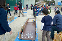 長短2種類のレーンを使い、ペットボトルをピンにしたボーリングです。